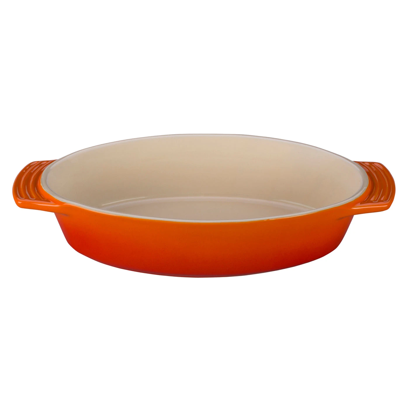 Casseroles, gratins and large desserts bake up beautifully in the 3 1/2 qt. oval dish. Flared sides aid in evaporation and prevent bubbling overflow.