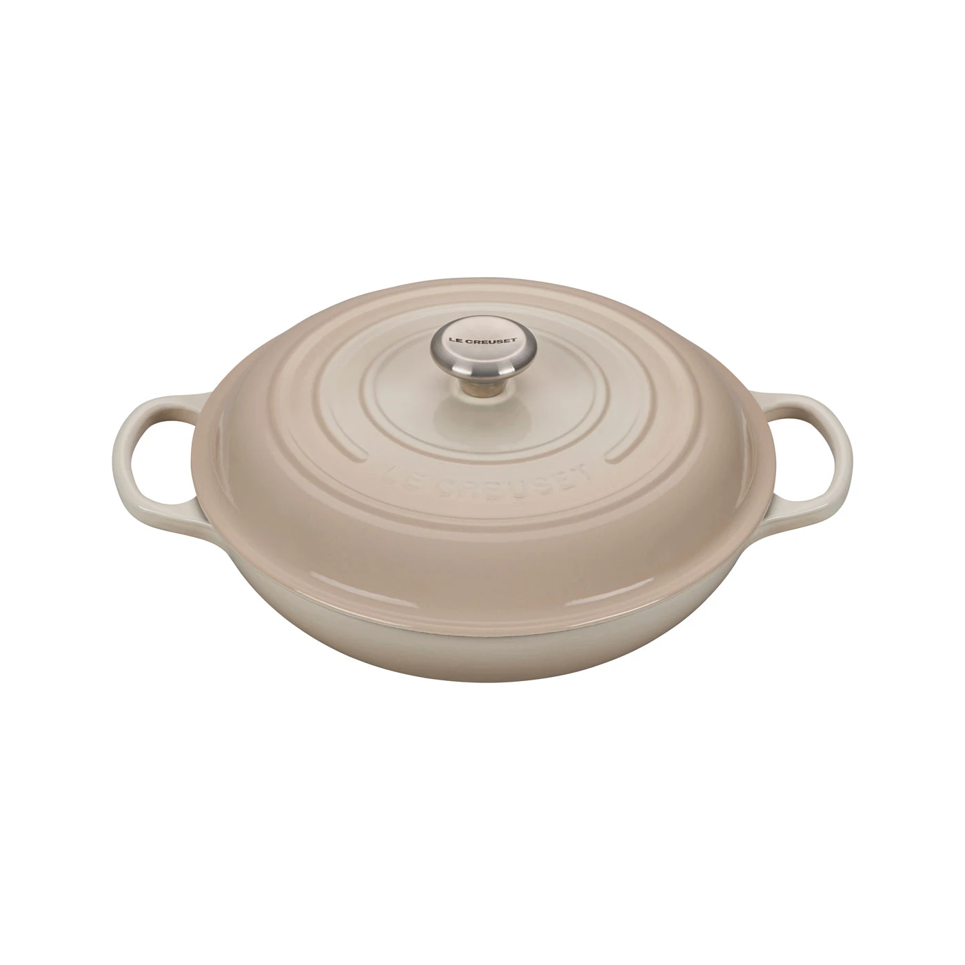 The enameled cast iron braiser is uniquely designed for maximum performance, transforming tough cuts of meat and hearty vegetables into tender, flavorful dishes. Food is first seared over high heat, then finished slowly in a flavorful liquid. The wide base of the braiser allows ingredients to be placed in a single layer for proper searing; once liquid is added, the domed lid continuously circulates steam to lock in moisture and flavor.