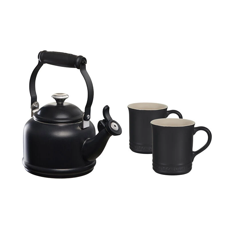 The Demi Kettle and Mug Set pairs our petite enamel on steel kettle with a charming set of matching stoneware mugs. The kettle is crafted from fast-heating premium carbon steel to rapidly bring water to a boil, and a fixed single-tone whistle alerts when the water is ready. Serve your favorite beverage in the perfectly color coordinated mugs – the generous 14-ounce capacity keeps contents warm or cold and is finished with a vibrant glaze which is easy to clean, dishwasher-safe, and resistant to chips, scratches and stains. The beautiful set makes an excellent gift for weddings, showers, parents, or any tea or coffee lover.